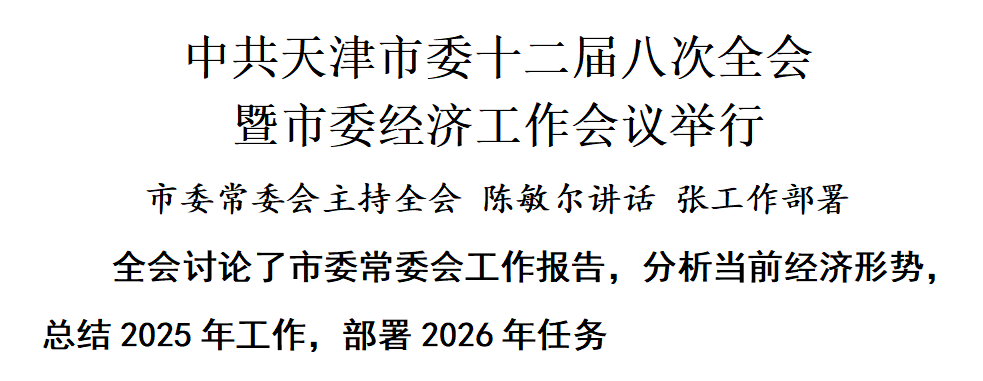 ![]() 中国共产党天津市第十二届委员会第八次全体会议决议 (2025年12月29日中国共产党天津市第十二届委员会第八次全体会议通过) 中国共产党天津市第十二届委员会第八次全体会议,于2025年12月29日召开。 出席这次全会的有,市委委员72名,市委候补委员11名。市纪律检查委员会常务委员会委员和有关方面负责同志列席会议。我市党的二十大代表和市第十二次党代会代表中的部分基层同志列席会议。 全会由市委常委会主持。全会讨论了《中共天津市委常委会工作报告》和《中共天津市委落实全面从严治党主体责任抓党建工作情况报告》。市委书记陈敏尔代表市委常委会向全会报告工作并讲话,市委副书记、市长张工对2026年经济工作作部署讲话。 全会一致认为,习近平总书记在中央经济工作会议上的重要讲话,全面总结今年经济工作,深入分析当前经济形势,系统部署明年经济工作,具有很强的政治性、思想性、指导性。要认真学习领会,切实把思想和行动统一到中央经济工作会议精神上来,深刻领会把握当前经济形势和做好新形势下经济工作的规律性认识,深刻领会把握党中央关于明年经济工作的总体要求、政策取向、重点任务和关于加强党对经济工作全面领导的重要要求,进一步增强深刻领悟“两个确立”的决定性意义、坚决做到“两个维护”的政治自觉思想自觉行动自觉。 全会充分肯定市委常委会2025年工作。一年来的工作很不平凡,成绩来之不易,值得倍加珍惜。在以习近平同志为核心的党中央坚强领导下,市委常委会全面贯彻党的二十大和二十届历次全会精神,坚持以学习贯彻习近平总书记视察天津重要讲话精神和对天津工作一系列重要指示要求为工作主线,全面落实党中央重大决策部署,带领全市上下感恩奋进、负重前行,坚持走内涵式发展路子,大力实施高质量发展“十项行动”,统筹推进科技创新、产业焕新、城市更新,有效盘活存量、做优增量、提升质量,着力保障和改善民生,更好统筹发展和安全,纵深推进全面从严治党,扎实开展深入贯彻中央八项规定精神学习教育,积极做好中央巡视等配合和有关反馈意见整改落实工作,圆满完成上海合作组织天津峰会筹备和服务保障任务,扎实完成全年经济社会发展目标任务,千方百计盘活存量和防范化解风险,科学谋划“十五五”规划,“十四五”即将顺利收官,全面建设社会主义现代化大都市迈出新的坚实步伐。这些成绩的取得,根本在于以习近平同志为核心的党中央领航掌舵,在于习近平新时代中国特色社会主义思想科学指引,离不开中央和国家机关各部门的大力支持,是全市广大党员干部群众齐心协力、共同奋斗的结果。要深刻认识习近平总书记、党中央的关心关怀是做好天津工作的最大动力,因地制宜、抓准抓实是有效落实习近平总书记重要要求、党中央决策部署的科学方法,真抓实干、攻坚克难是推动天津高质量发展的关键所在,善作善成、见行见效是检验工作实绩的重要标尺,担当作为、拼搏进取是党员干部干事创业的应尽之责。 全会指出,2026年是我市“十五五”开局起步之年,是各项整改任务落地见效之年,是攻坚克难关键之年。做好明年工作,总体要求是:以习近平新时代中国特色社会主义思想为指导,深入贯彻党的二十大和二十届历次全会精神,认真贯彻中央经济工作会议精神,全面落实习近平总书记视察天津重要讲话精神和对天津工作一系列重要指示要求,聚焦经济建设这一中心工作和高质量发展这一首要任务,完整准确全面贯彻新发展理念,积极服务和融入构建新发展格局,坚持稳中求进工作总基调,更好统筹发展和安全,以推进京津冀协同发展为战略牵引,扎实实施高质量发展“十项行动”,深入推进科技创新、产业焕新、城市更新,深化盘活存量、做优增量、提升质量,因地制宜发展新质生产力,充分激发有效需求,持续防范化解重点领域风险,着力稳就业、稳企业、稳市场、稳预期,推动经济实现质的有效提升和量的合理增长,不断提高人民生活水平,保持社会和谐稳定,实现“十五五”良好开局。 全会强调,要坚持目标导向、聚力开局起步,坚持问题导向、着力攻坚克难,坚持结果导向、努力提质增效,持续提高发展含“新”量、含“科”量、含“金”量、含“绿”量。 全会强调,要在聚焦区域一体化和京津同城化、推动京津冀协同发展走深走实上下功夫见实效。深度融入现代化首都都市圈,充分用好北京(京津冀)国际科技创新中心建设扩围机遇,推动“六链五群”扩容升级,统筹推进交通、生态环境、文化和旅游、公共服务等重点领域合作。 全会强调,要在以科技创新引领新质生产力发展、加快建设现代化产业体系上下功夫见实效。巩固壮大先进制造业,大力发展绿色石化、汽车、高端装备、新一代信息技术、新能源新材料、生命健康、循环经济等重点产业,加快发展金融服务、科技服务、设计服务、信息服务、现代运输与航运服务、商贸商务服务等生产性服务业,繁荣发展文旅、养老、体育等生活性服务业,做精做特现代都市型农业。强化企业创新主体地位,持续做好对大院大所的服务保障工作,加强应用创新研究,用好天开高教科创园等科创园区载体资源,把更多的科技成果转化到企业里去、转化为现实生产力。 全会强调,要在促消费扩投资、充分激发有效需求上下功夫