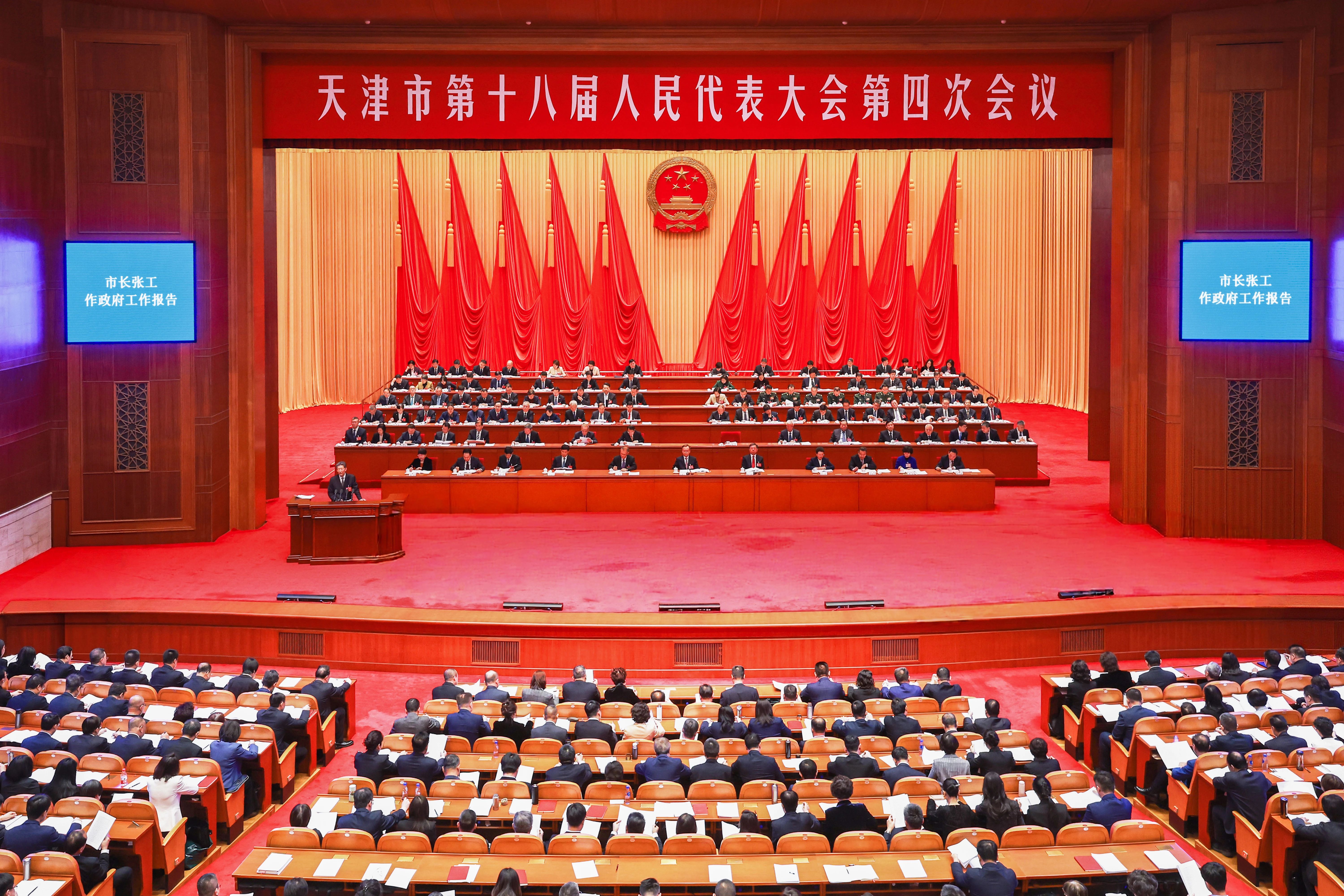 大会主席团常务主席、执行主席喻云林主持会议。 大会主席团成员王常松在主席台就座。 市十八届人大四次会议应出席代表698人,实到代表662人,符合法定人数。 上午10时,喻云林宣布:天津市第十八届人民代表大会第四次会议开幕。雄壮的中华人民共和国国歌在大厅内响起。 市长张工代表市人民政府作政府工作报告。报告共分三个部分:2025年和“十四五”时期工作回顾;“十五五”时期主要目标与重点任务;2026年重点工作。 张工在报告中指出,过去一年是天津大事要事难事集中交织的一年。在市委坚强领导下,我们坚持以习近平新时代中国特色社会主义思想为指导,全面贯彻党的二十大和二十届历次全会精神,以学习贯彻习近平总书记视察天津重要讲话精神和对天津工作一系列重要指示要求为工作主线,深入落实“一个战略牵引”、“四个善作善成”、加强党的建设的重要要求,统筹把握政策机遇和自身潜能,统筹应对多重压力和各种挑战,圆满完成上合组织天津峰会筹备和服务保障任务,扎实推进高质量发展“十项行动”和“三新”、“三量”工作,持续夯实高质量发展基础,进一步提升改革开放质效,有力有效推进城市治理,稳步实施乡村全面振兴,用心用力改善民生,切实加强政府自身建设,在多线并进、攻坚克难中努力推进经济实现质的有效提升和量的合理增长。 张工在报告中指出,“十四五”时期是天津爬坡过坎、积势发展的五年。我们迎难而上、砥砺前行,京津冀协同发展动能不断显现,科技创新和产业创新加快融合,全面深化改革开放纵深推进,超大城市治理综合效能持续释放,民生保障扎实有力,城市安全稳定基底更加稳固,高质量发展稳的态势有所巩固、进的支撑持续积累、好的预期不断释放。五年来成就的取得,根本在于以习近平同志为核心的党中央领航掌舵,在于习近平新时代中国特色社会主义思想科学指引,是党中央、国务院坚强领导、关怀支持的结果,是市委带领广大干部群众顽强拼搏、开拓进取的结果,是市人大及其常委会、市政协和社会各界团结协作、有效监督的结果。同时我们也清醒认识到,政府工作还存在不少问题和不足,要以更务实举措改进工作,不辜负全市人民的厚望。 张工在报告中指出,“十五五”时期全市经济社会发展主要目标是:高质量发展取得明显成效,科技创新能力大幅提高,进一步全面深化改革开放实现新突破,城市文明程度持续提升,人民生活品质不断提高,美丽天津建设取得重要进展,韧性安全城市建设水平明显提升。在此基础上再奋斗五年,到二〇三五年基本建成高质量发展、高能级改革开放、高效能治理、高品质生活、高水平安全的社会主义现代化大都市。实现上述目标,重点从以下几个方面把握:以推进京津冀协同发展为战略牵引,推动形成深度融合的发展格局;以科技创新引领新质生产力发展,巩固壮大实体经济根基;全方位扩大有效需求,服务建设强大国内市场和构建新发展格局;进一步全面深化改革开放,增强发展内生动力和活力;坚持走内涵式发展路子,促进城乡融合发展;坚持以文化人、以文惠民、以文润城、以文兴业,推动文化传承发展;着力保障和改善民生,扎实推进共同富裕;加快经济社会发展全面绿色转型,建设美丽天津;提升城市治理现代化水平,建设更高水平平安天津。 张工在报告中指出,今年是“十五五”开局起步之年。全市经济社会发展主要预期目标是:地区生产总值增长4.5%,在实际工作中努力争取更好结果;一般公共预算收入增长2%;固定资产投资提质增效;城镇调查失业率5.5%左右,城镇新增就业28万人;居民消费价格涨幅2%左右;居民收入增长和经济增长基本同步;节能减排减污降碳指标完成国家下达目标。在实际工作中,我们要更加注重稳中求进、提质增效,更加注重因地制宜、深挖潜能、紧密结合天津实际,更加注重积极进取、攻坚克难,更加注重盯紧盯实、抓牢抓严中央巡视等指出问题整改落实。重点抓好以下工作:一是持续发挥京津冀协同发展效能,对接融入首都产业协同圈,主动融入首都通勤圈,积极融入首都功能圈。二是全面强化科技创新支撑引领,积极共建北京(京津冀)国际科技创新中心,增强天开园全域全要素创新引领辐射,做优科创服务生态,一体推进教育科技人才发展。三是着力构建现代化产业体系,推动制造业转型升级、提质增效,加快生产性服务业转型发展,强化存量增量双支撑。四是进一步挖掘有效需求潜力,扩容提质多元消费,稳步扩大有效益投资,提升质效盘活存量资源。五是加快释放改革开放成效,系统推进重点领域改革,推动开放能级跃升,做强大区支撑。六是不断提升城市治理现代化水平,深化“大城三管”,优化推进城市更新,加大生态环境保护治理力度,提升城市韧性安全水平。七是扎实推进乡村全面振兴,发展现代都市型农业,推动乡村建设提质升级,提高城乡要素配置水平。八是全力办好民生实事增进民生福祉,兜牢社会保障底线,推进教育医疗优质均衡,推动文旅体融合发展。 张工在报告中指出,新征程新使命对政府自身建设提出了新任务新要求。要学思践悟党的创新理论,更加深刻领悟“两个确立”的决定性意义,坚决做到“两个维护”,以更强自觉笃信笃行,以更优效能依法行政,以更严要求廉洁履职,以更硬担当务实重干,不折不扣落实中央决策部署和市